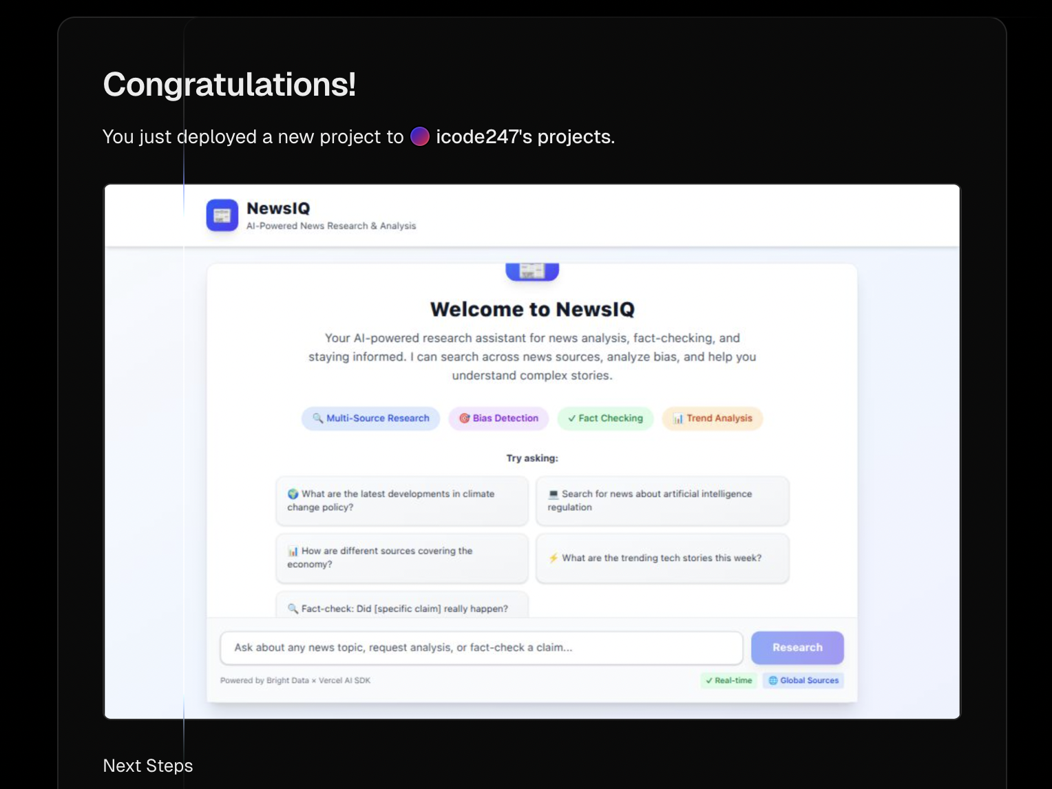 Мы создадим NewsIQ, полноценный помощник для исследования новостей с помощью ИИ, используя Bright Data и Vercel ИИ SDK. Мы создадим решение для обработки новостей из любого источника и проведения интеллектуального анализа с помощью разговорного интерфейса.
