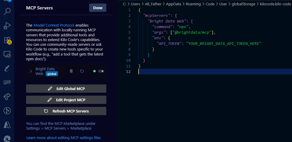 На панели Kilo Code нажмите на значок шестеренки и перейдите в раздел MCP-серверов. Найдите опцию “Edit Global MCP”, которая откроет файл конфигурации, в котором вы определите подключения к серверу. Этот файл использует формат JSON и позволяет указать несколько MCP-серверов, если это необходимо.